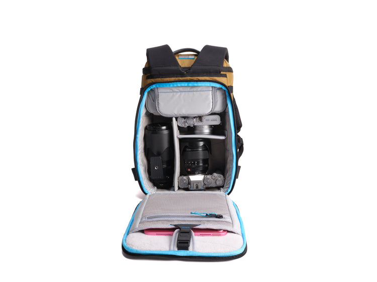 Fits a mirrorless camera with two lenses plus an 11” iPad, with customizable dividers and smart organization.